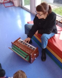 L’artiste développe avec les enfants un langage poétique avec le corps, la voix et à la musique.
