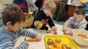 Ils ont épluché les légumes, les ont lavés et coupés en morceaux. Au réveil de la sieste, la soupe était prête et les enfants ont dégusté avec grand plaisir cette soupe au caillou !