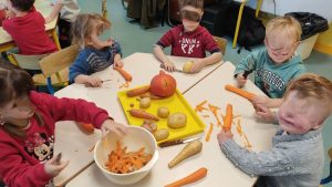 Cette semaine, ils ont donc (re) découvert les légumes présents dans l’histoire (le chou, le navet, les pommes de terre, les carottes) puis ils ont cuisiné LEUR propre soupe.